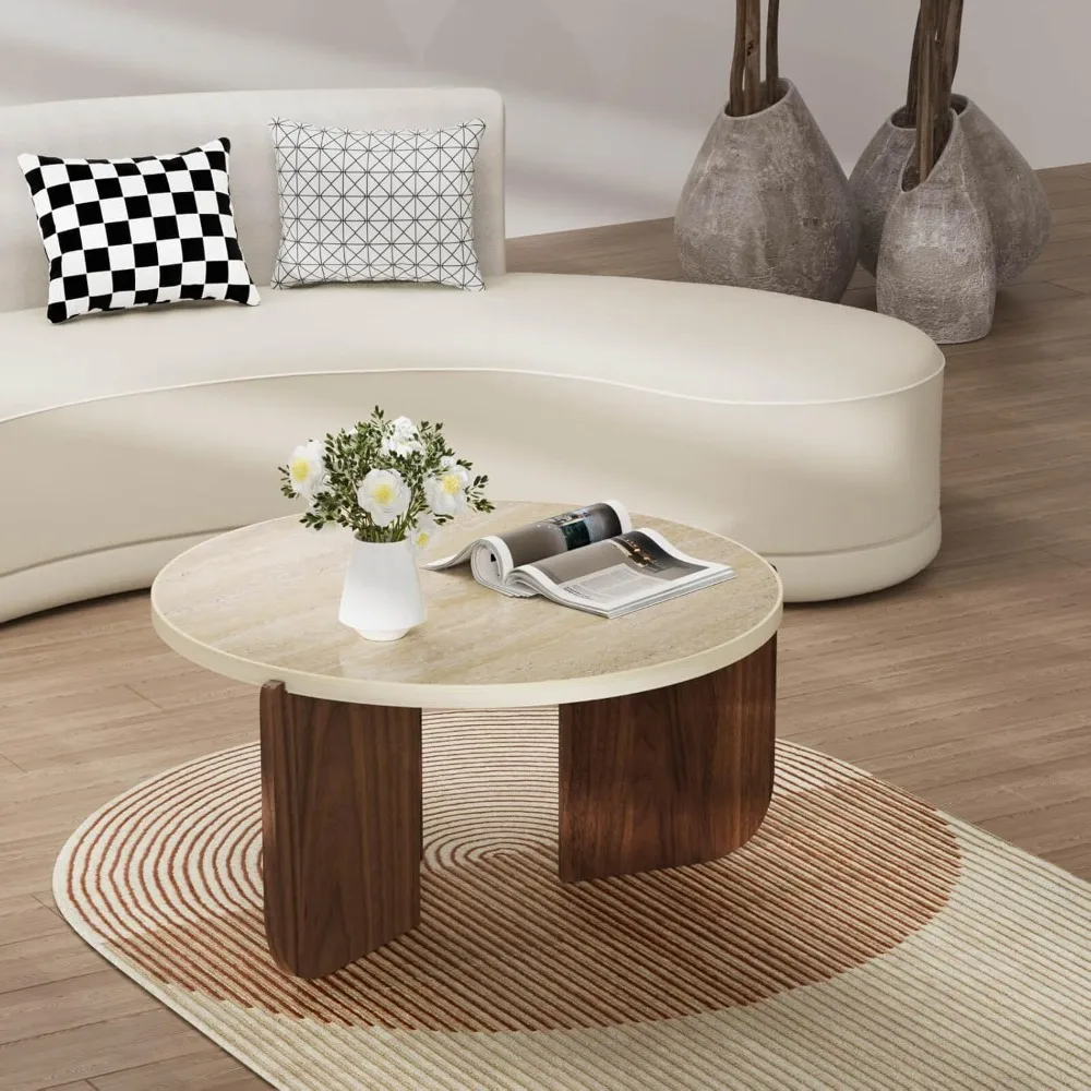 This coffee table is a perfect blend of nature and modern design, featuring a travertine top that brings the warmth and patterns of stone indoors. It's not just a table, but a piece of art that enhances the aesthetic appeal of your home with its beige tones and organic designs, creating a serene and inviting space. The artificial travertine surface boasts beautiful textures and a timeless earthy charm that suits any decor. Its round shape and clean lines give it a contemporary edge, making it a stylish addition to your living room. Durability and strength are not compromised, ensuring this table stands the test of time. Versatile in its appeal, it fits seamlessly into various settings, from modern apartments to rustic homes, making it a must-have for any living space.